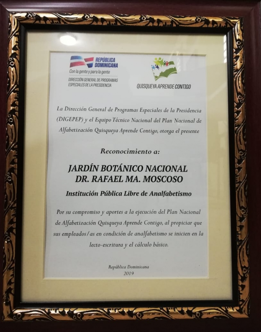 Con esta distinción, el Jardín Botánico Nacional forma parte de las instituciones del Estado que están libres de analfabetismo al capacitar a un equipo de 29 de sus servidores.