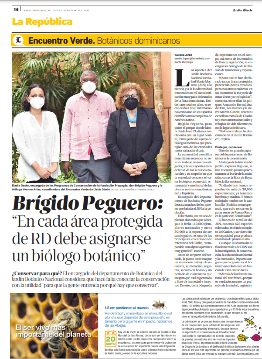 Agradecemos al Encuentro Verde del periódico Listín Diario, coordinado por la bióloga Yvonne Arias, Eladia Gesto, encargada de los Programas de Conservación de la Fundación Propagas, y a la periodista Yaniris López, por la realización de este reportaje a nuestro biólogo Brígido Peguero, encargado del Departamento de Botánica sobre su labor profesional.