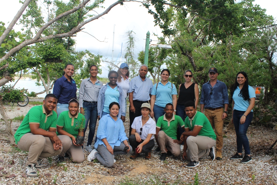 Tanja Lieuw, Conservation Finance Program Manager del Caribbean Biodiversity Fund, el Síndico Bayahibe, Enriquillo Luis Brito, la regidora y presidenta de la Sala Capitular, Jelen Brito, la directora de la Asociación de Hoteles Romana- Bayahíbe, Ana García Sotoca, de Fundemar Yulissa Reyes y Andreina Valdez y estudiantes de nivel secundario del Liceo Bayahíbe a cargo de la profesora María Isabel Pérez.