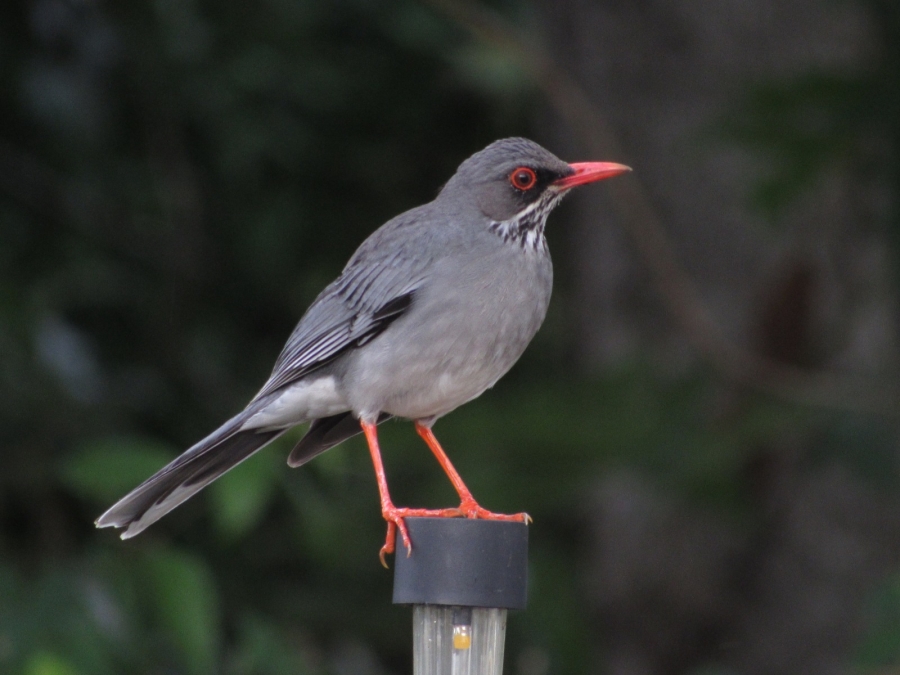 Esta especie es un zorzal grande, sus plumas son en su mayoría grisáceas; las patas, pico y el anillo ocular rojo, su garganta es blanco con vetas negras. En el Jardín Botánico se puede ver frecuentemente en la grama o perchada en una rama cantando o haciendo algún reclamo. Si al caminar por el jardín, generalmente durante el amanecer o en el anochecer te cruza un ave de repente, lo más probable es que es un Chua-Chua.
